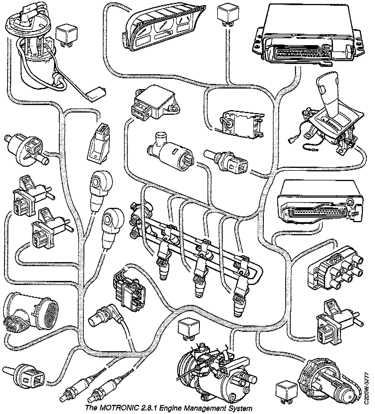 The Motronic engine management system mainly controls ignition and fuel injection.