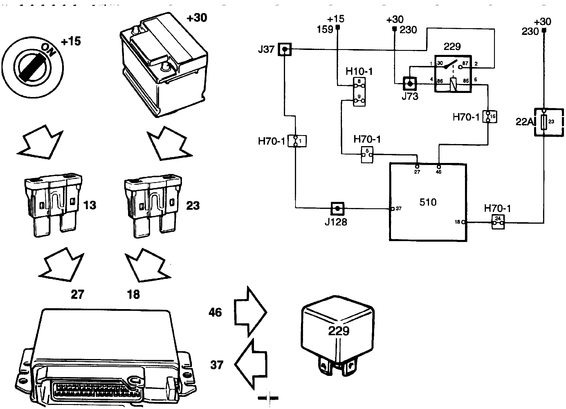When +15 is applied to pin 27 the control module is activated, grounding pin 46 and causing the main relay to operate. The main relay supplies the control module with positive battery voltage on pin 37.