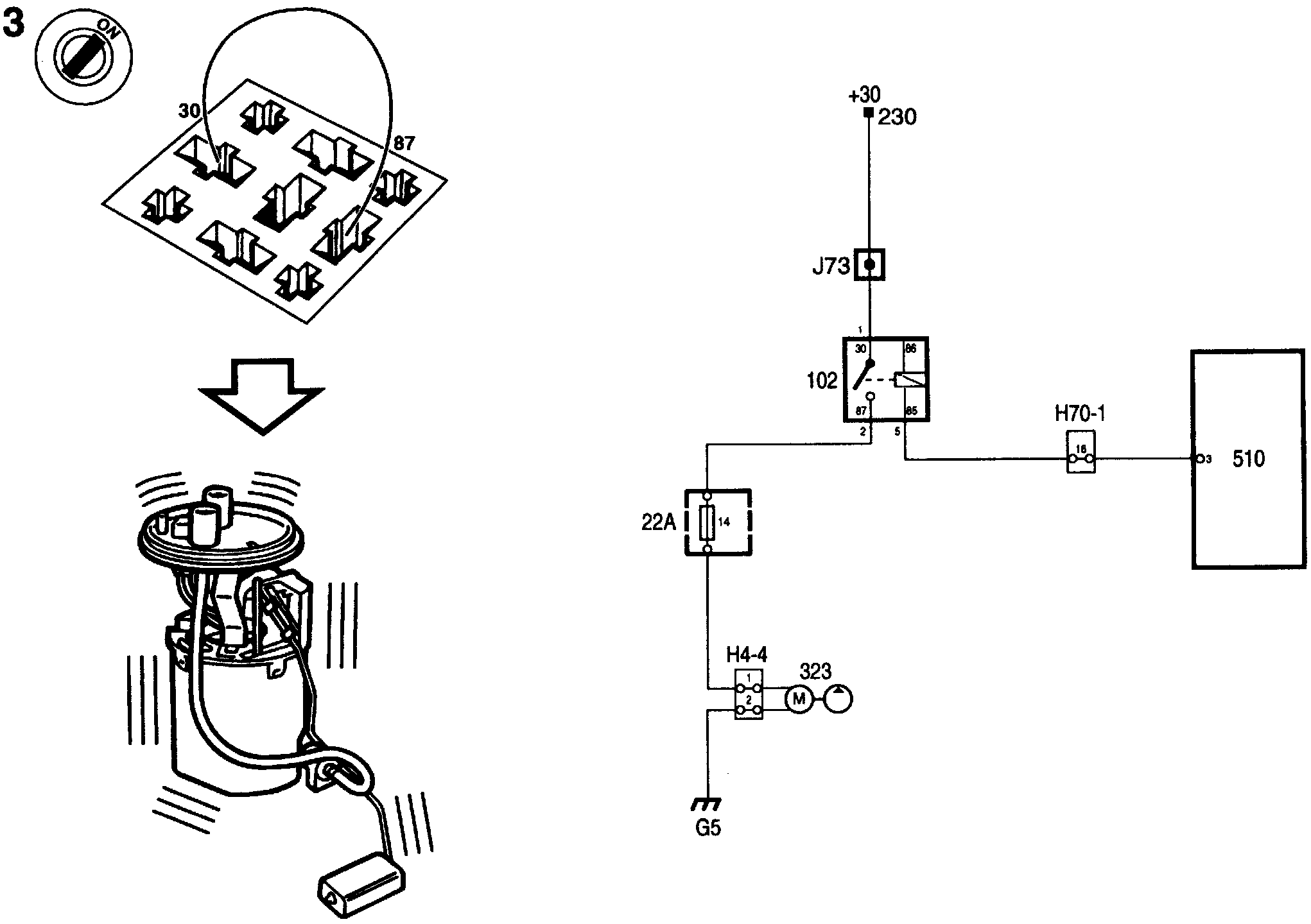 If the fuel pump does not work, connect the test lamp to pin 30 and a good ground to check the power supply when the ignition switch is turned to the ON position.