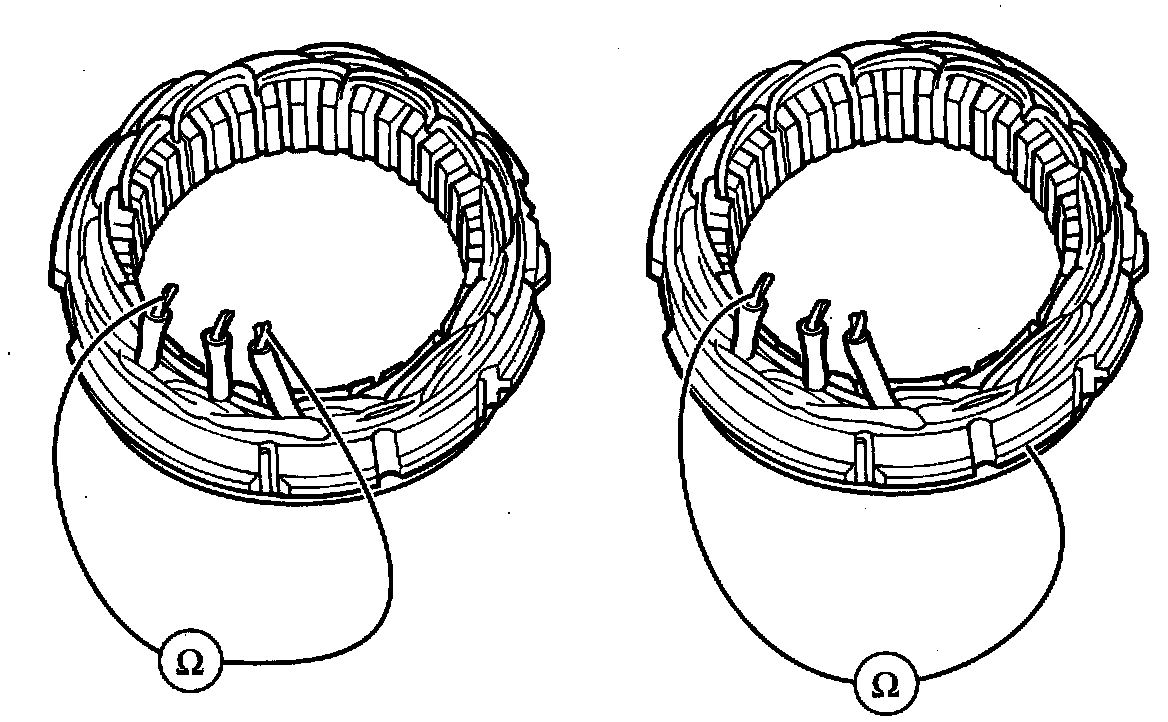 Use an ohmmeter (5 x 1000 range) to measure the resistance between the stator frame and each of the stator windings.