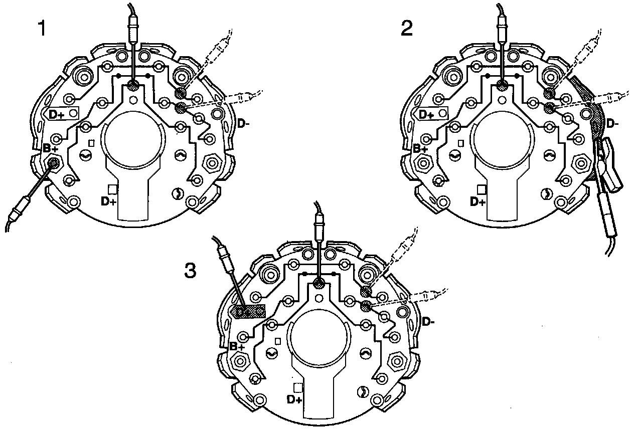 The test lamp should light up when its positive terminal (max. 40 V) is connected to one of the stator connection points, or the ohmmeter should give a low resistance reading when its positive lead is connected to D-.