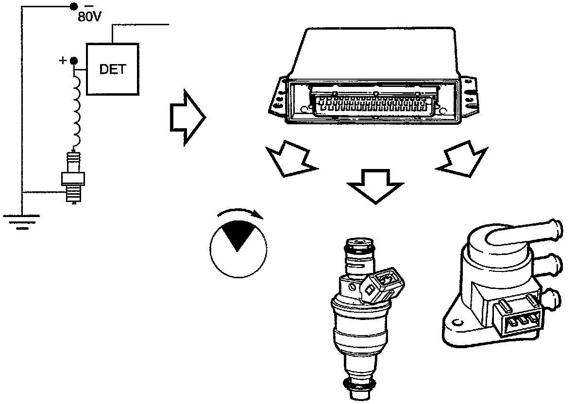 By analyzing the ionization current passing through the spark plugs, the control module determines whether knocking occurs in any of the cylinders. If knocking is detected, the ignition will be retarded. If the ignition is heavily retarded or if charging pressure is high, fuel enrichment will also take place. As a last resort, charging pressure will be reduced.