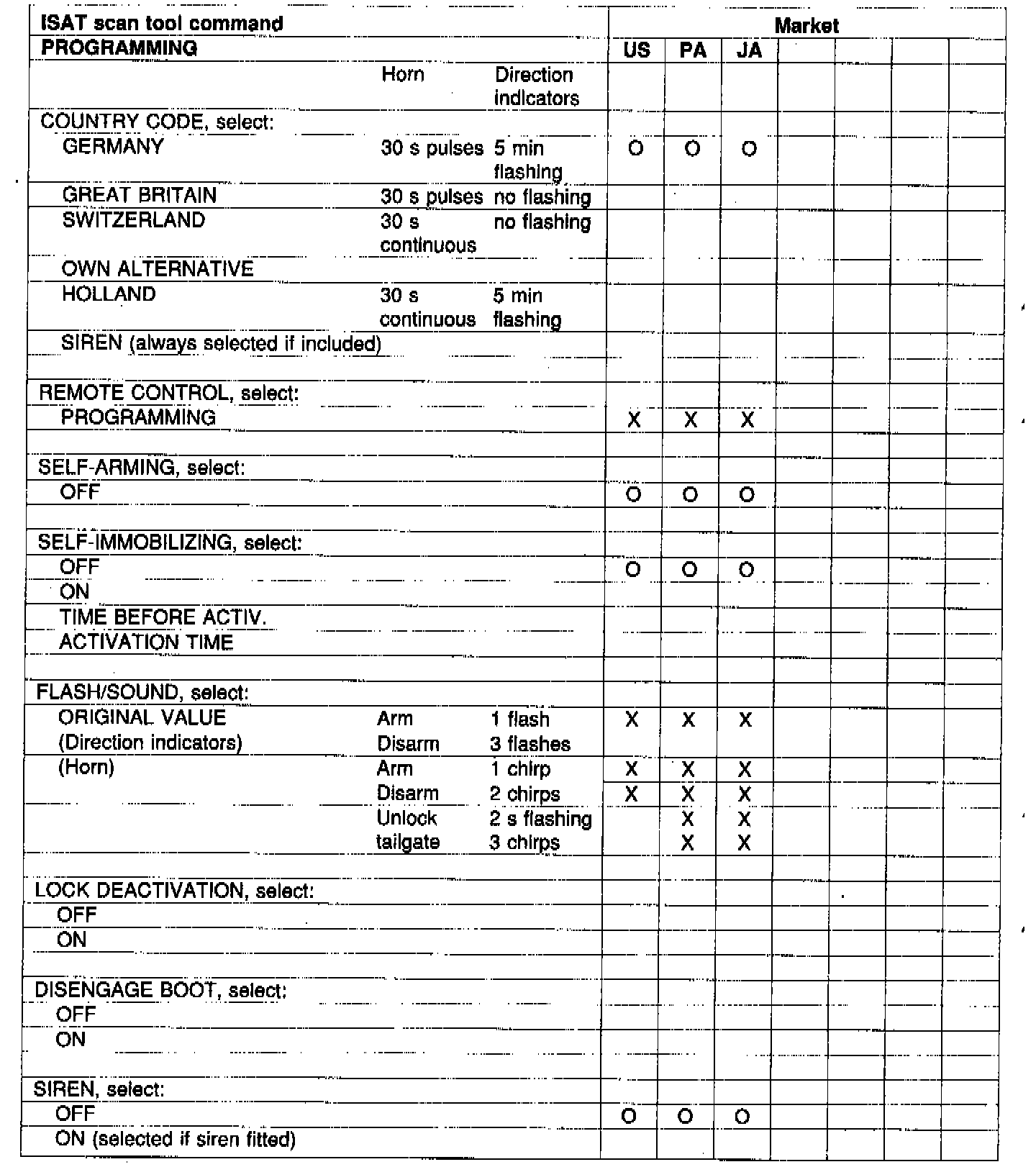 Basic programming of the anti-theft alarm's electronic control module is carried out by the supplier. Subsequently, EOL programming is carried out at the factory. However, since this cannot meet the needs of all countries, additional programming has to be carried out in connection with pre-delivery service, see table below. In the event of electronic control module replacement, the anti-theft alarm must be programmed in accordance with spare part programming, see table below.