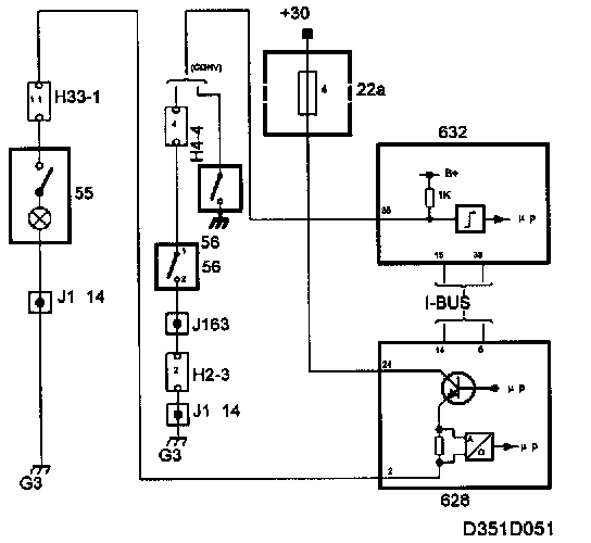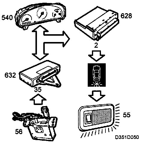 TWICE outputs information about the lid status (OPEN/CLOSED) to the instrument bus and the information is read by DICE. If the lid is open, power is supplied from DICE pin 2 to the lamp (55). If the switch on the luggage compartment lamp is not closed, the lamp will not light, irrespective of the lid status according to TWICE.