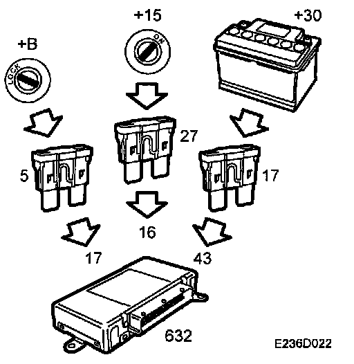 Control Module Power SupplyPower supply +30 circuitFrom fuse 17 (22a) to the control module pin 43.