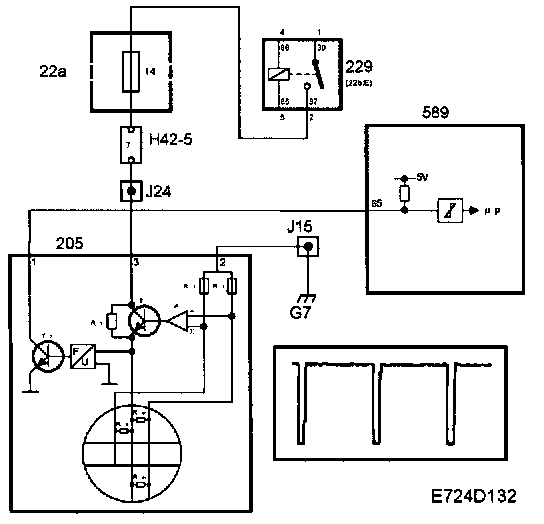 When the ignition switch is turned to the "ON" position, the main relay operates and B+ is supplied to pin 3 on the mass air flow sensor. A current passes RT and the low-ohmic thermal resistors RH via R1 to ground. As the RH resistors are cold, their resistance is low. The amplifier then sends a strong base current to transistor T1, whereby RH rapidly heat up. As RH heat up, the resistance increases and a state of equilibrium is achieved.