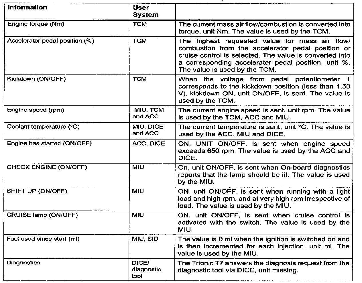 A diagnostic trouble code will be generated in the Trionic T7 and TCM control modules if any information they obtain from the bus has an incorrect value. The diagnostic trouble code text indicates the system where the fault is located.