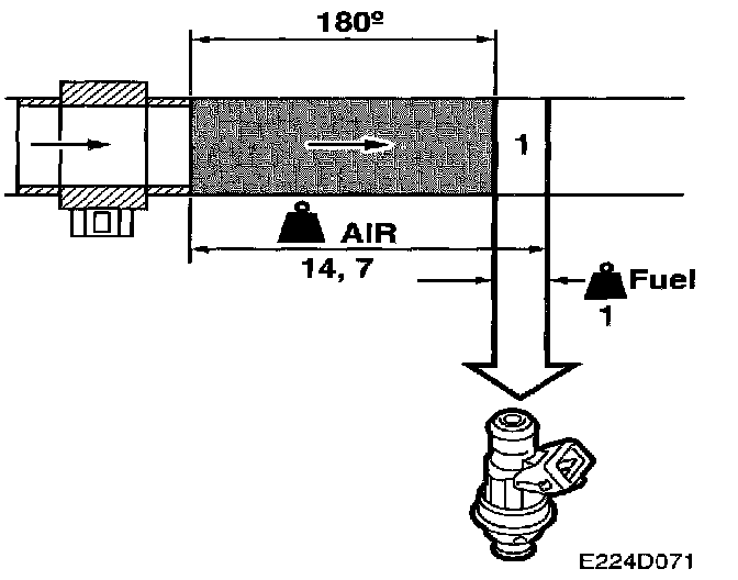 To achieve lambda = 1, there must be a specific fuel/air ratio, namely 1 kg fuel to 14.7 kg air. As we know how much air has been drawn into each cylinder per combustion, the control module can easily calculate how much fuel is to be injected into the cylinders each time. The milligrams air/combustion figure is divided by 14.7 and the result is the number of mg fuel/combustion to be injected into each cylinder.