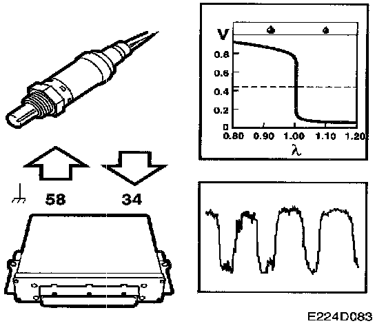 To work well, the catalytic converter requires an air/fuel ratio of precisely 14.7:1. Therefore the system is fitted with an oxygen sensor, called oxygen sensor 1 or 02S 1, mounted before the catalytic converter. The oxygen sensor is connected to control module pin 34 and grounded via control module pin 58.
