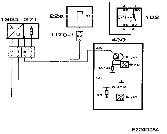 To produce a voltage signal quickly after starting, the oxygen sensor must be preheated. The preheating element is supplied with B+ current from the fuel pump relay via fuse 15 and grounded via control module pin 49.