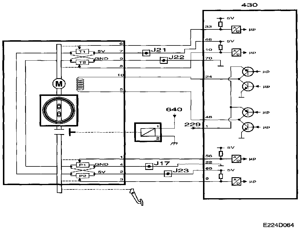 Two throttle position sensors are connected to the throttle spindle. The sensors consist of potentiometers which are supplied with 5 V from control module pins 46 and 69, which are internally connected to each other in the throttle body and grounded via control module pins 22 and 70 which are also connected to each other inside the throttle body.