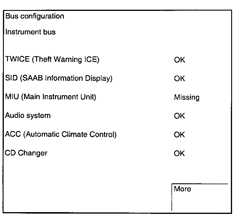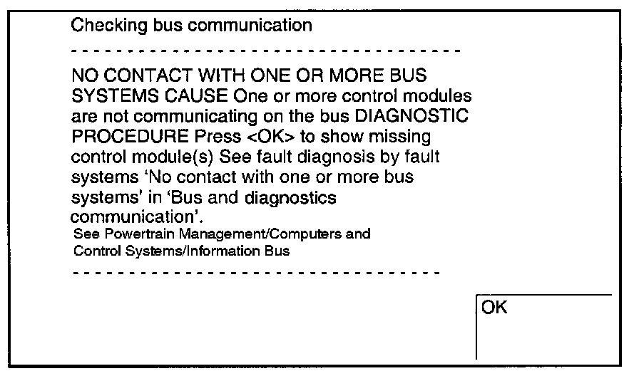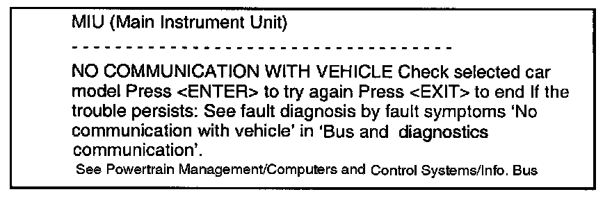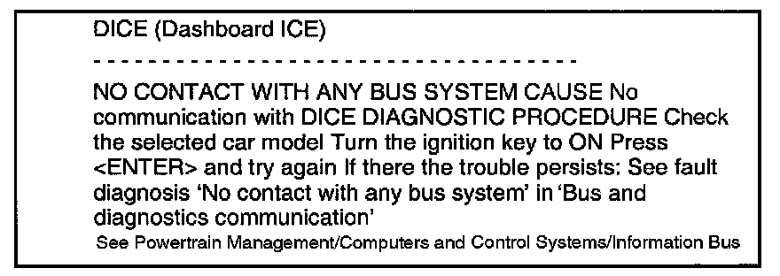 If the Tech 2 cannot contact the DICE, neither can it check that the control modules connected to a bus are communicating correctly. The fault is probably because the DICE is not supplied with current or the diagnostics cable is not connected to the DICE (pin 7 of the data link connector and pin 28 of the DICE). The following menu will appear on the Tech 2: