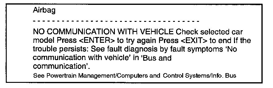The fault is probably because the Airbag or ABS control module is not supplied with current or the diagnostics cable is not connected to the control module. If the Tech 2 cannot contact the Airbag or ABS, the following menu will appear: