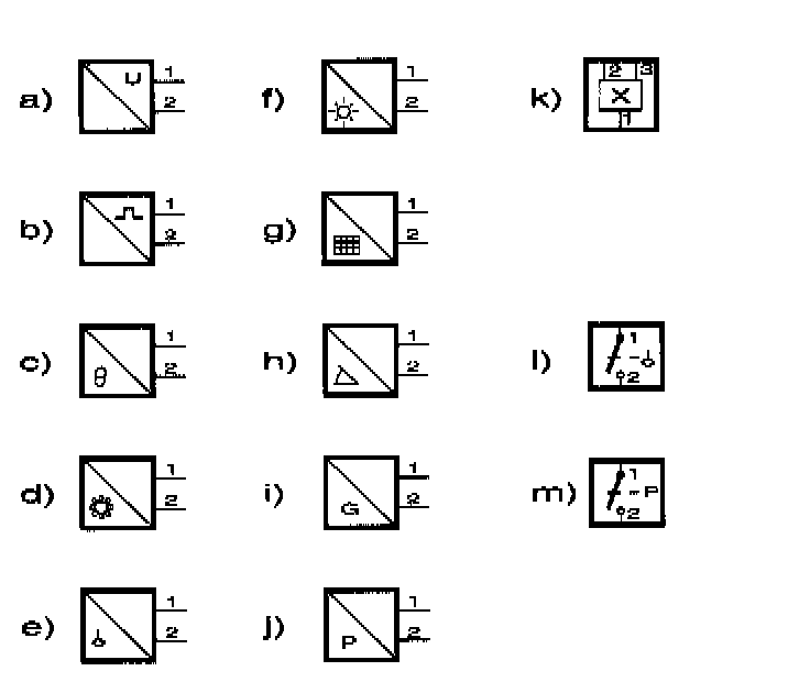 The symbols for sensors and monitors have been simplified. The connector/output side of the sensors have an internal symbol showing the type of output signal and the other half is a symbol showing the measured quantity.