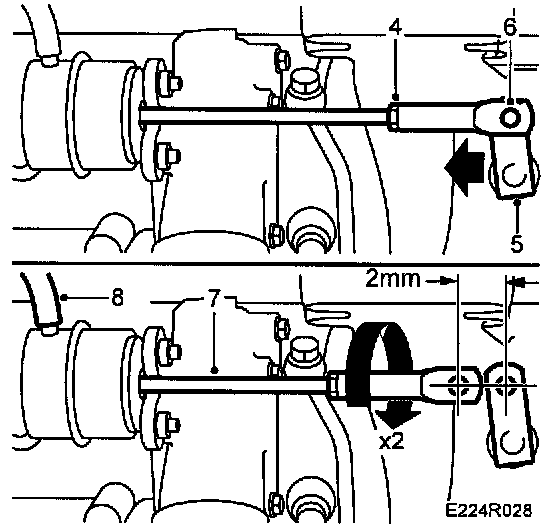 7 Detach the pushrod from the operating arm pin. Turn the end piece clockwise about 2 turns so that a prestress of 2 mm obtained. Attach the push rod to the operating arm pin. Fit the circlip.