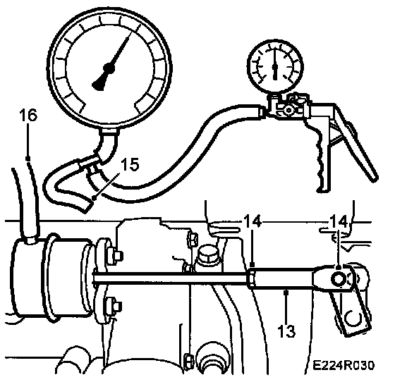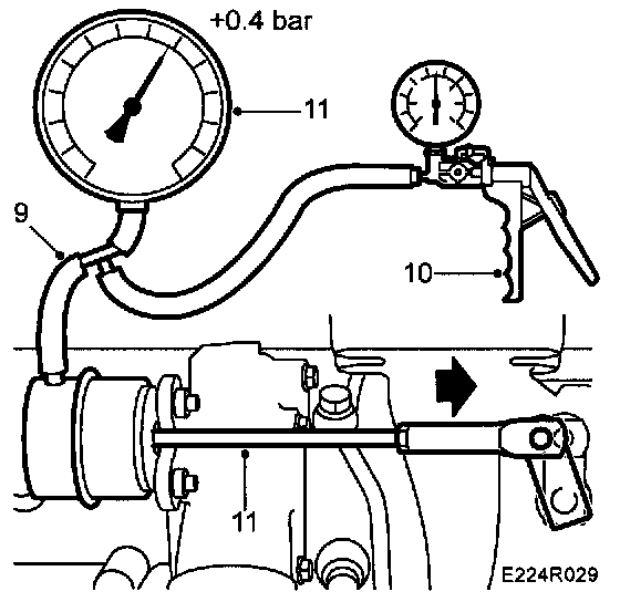 11 When the control rod has just started moving read the pressure on the pressure gauge scale. The pressure should be at least 0.4 bar for low pressure turbo and 0.45 bar for full turbo.
