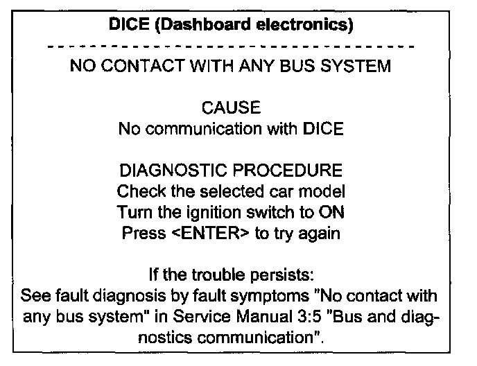 If the Tech 2 cannot contact the DICE, neither can it check that the control modules connected to a bus are communicating correctly. The fault is probably because the DICE is not supplied with current or the diagnostics cable is not connected to the DICE (pin 7 of the data link connector and pin 28 of the DICE).