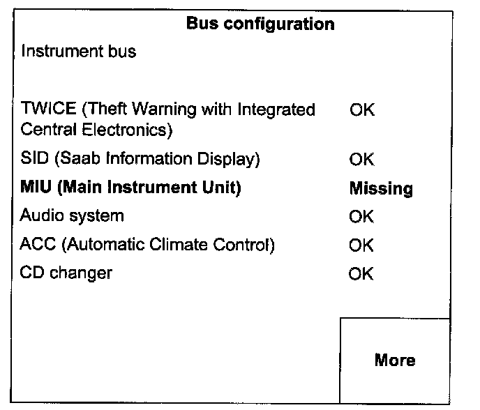 Regardless of the control module selected in the Tech 2 menu, the Tech 2 will first contact the DICE to check that all control modules connected to a bus are communicating correctly. A warning is given by the Tech 2 in the event of a fault. The Tech 2 can detect the following faults: