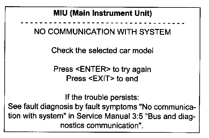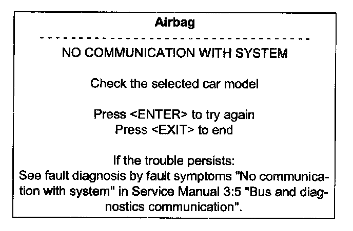 The fault is probably because the Airbag or ABS control module is not supplied with current or the diagnostics cable is not connected to the control module. If the Tech 2 cannot contact the Airbag or ABS, this menu will appear: