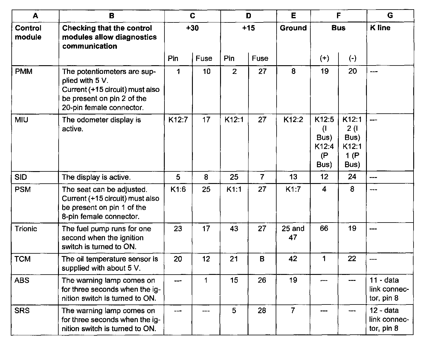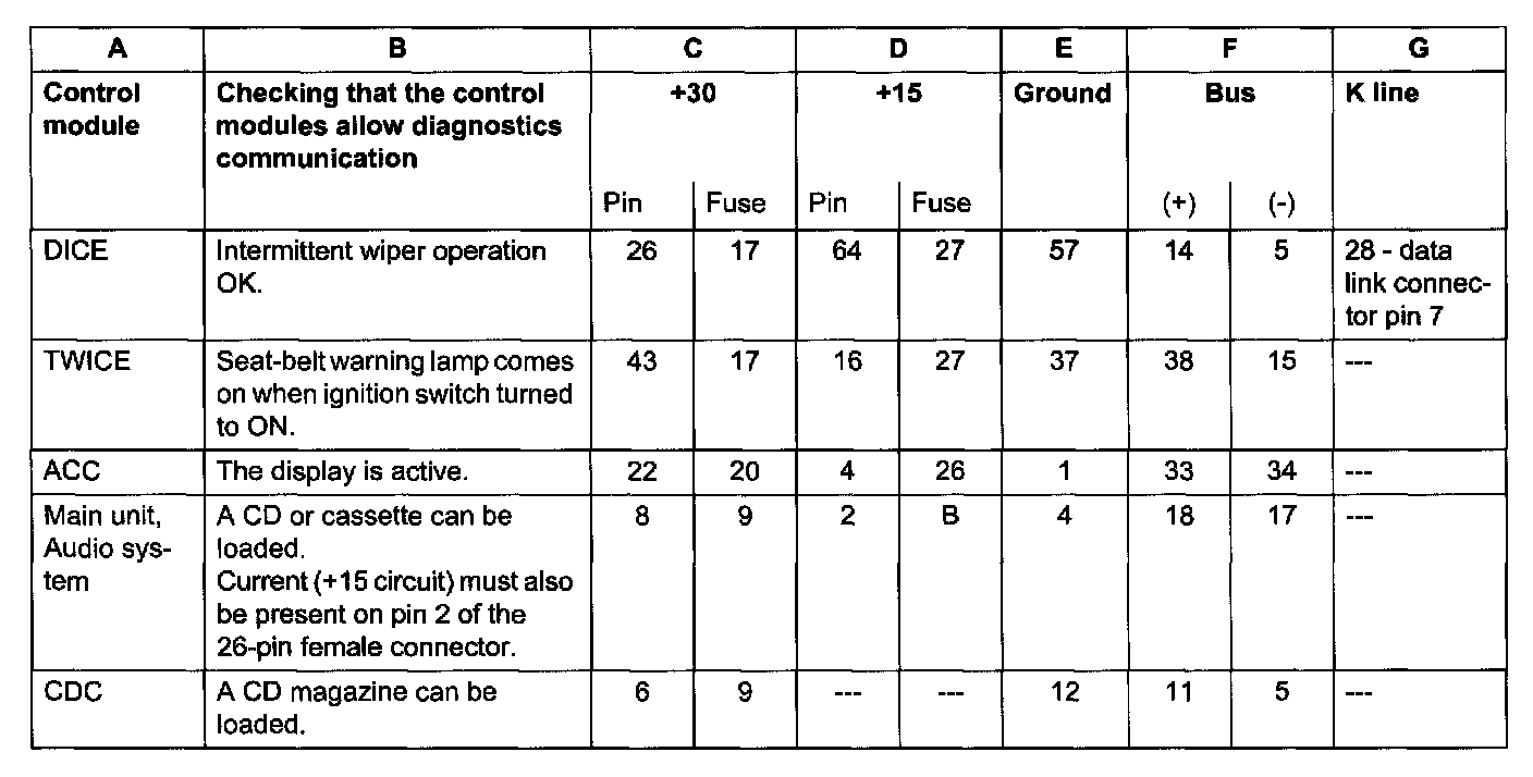 A simple means of checking whether the control modules are operative and allow diagnostics communication (column B) is given for each control module (column A) in the table below.