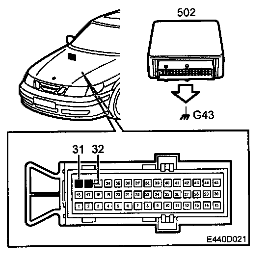 The control module is grounded at grounding point G 43 through pins 31 and 32. The grounding points are connected internally.