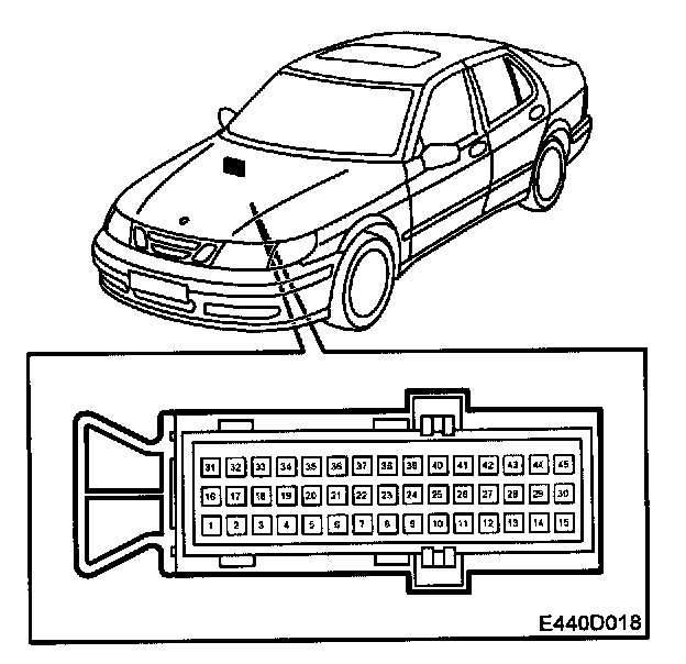 The control module has a 45-pin connector and is located behind the glove box in the passenger area. It is programmed for either engine types B205E, B235E or B308E and must only be used in Saab 9-5 together with the engine type in question. The control module receives information from a number of its own sensors as well as from other electronic systems. The information is processed and the control module controls the engaged gear and shifting point based on the selected driving program (NORMAL or WINTER).