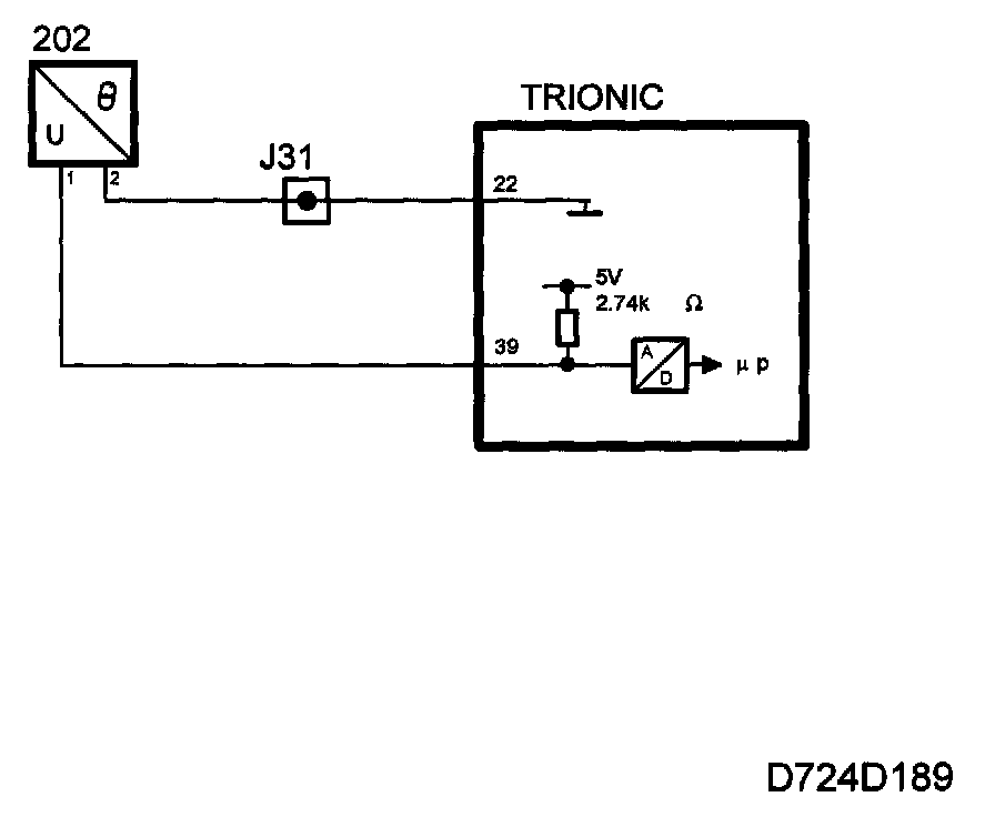 The control module measures the coolant temperature by supplying the sensor with 5 V from pin 39 via a 1.0 kOhm resistor integrated in the control module. The sensor is grounded via control module pin 22. The voltage across the resistor is proportional to the engine coolant temperature.