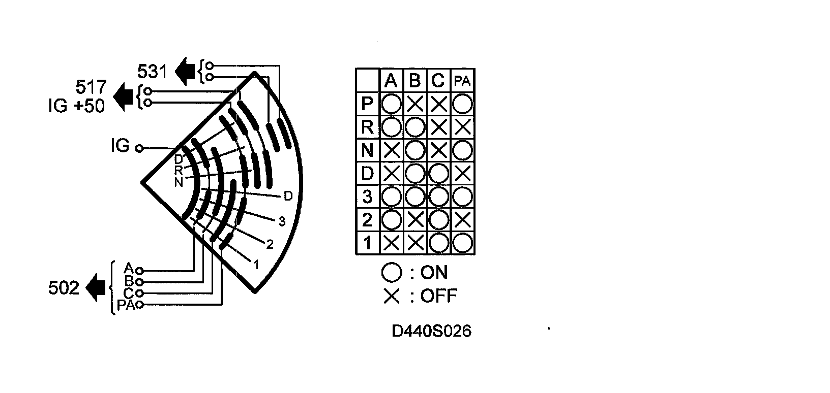Selector lever position A, B, C and PA contacts