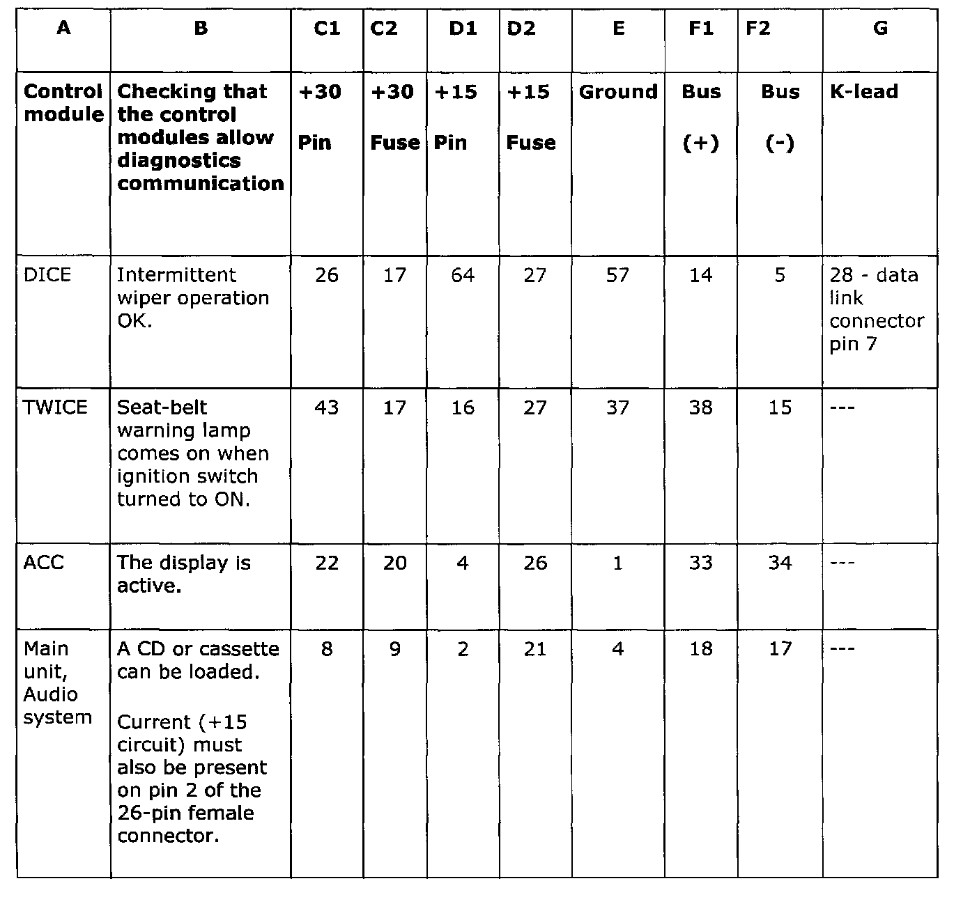A simple means of checking whether the control modules are operative and allow diagnostics communication (column B) is given for each control module (column A) in the table.