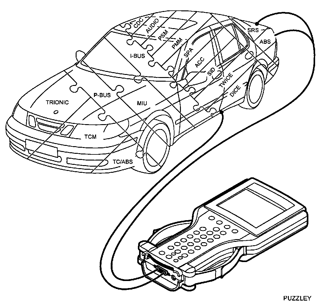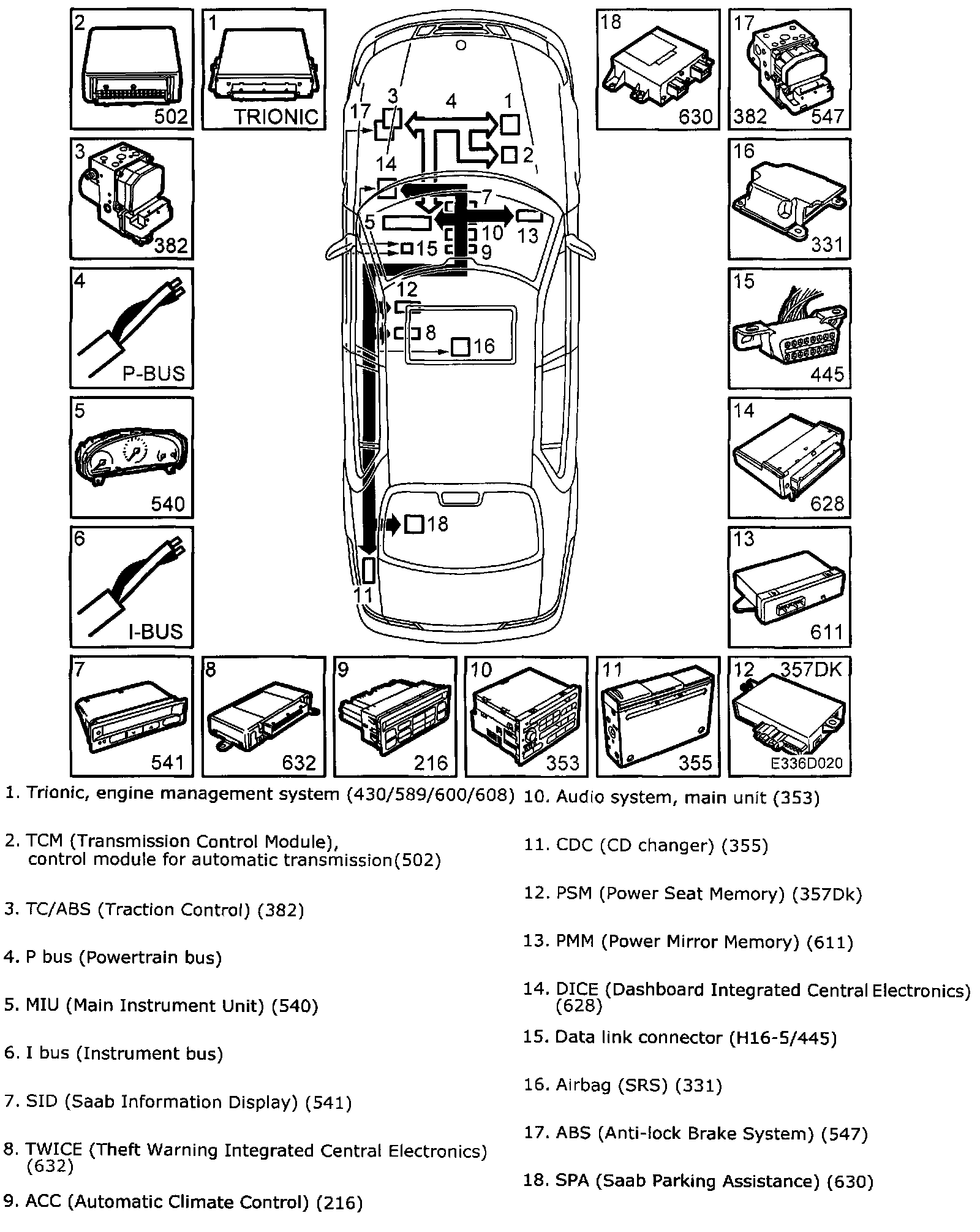 All control modules in the Saab 9-5 are connected to the bus with the exception of ABS and SRS. For cars with Traction Control, the TC/ABS control module is connected to the bus.