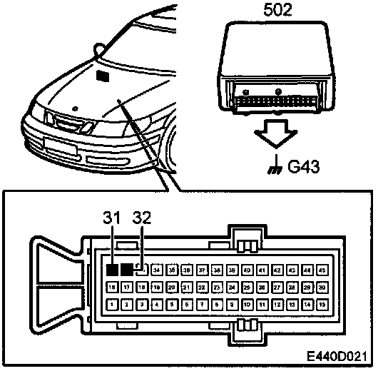 The control module is grounded at grounding point G43 through pins 31 and 32. The grounding points are connected internally.