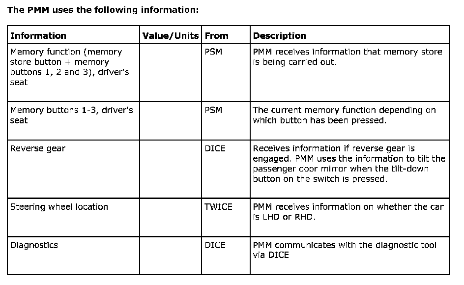 The PMM uses the following information: