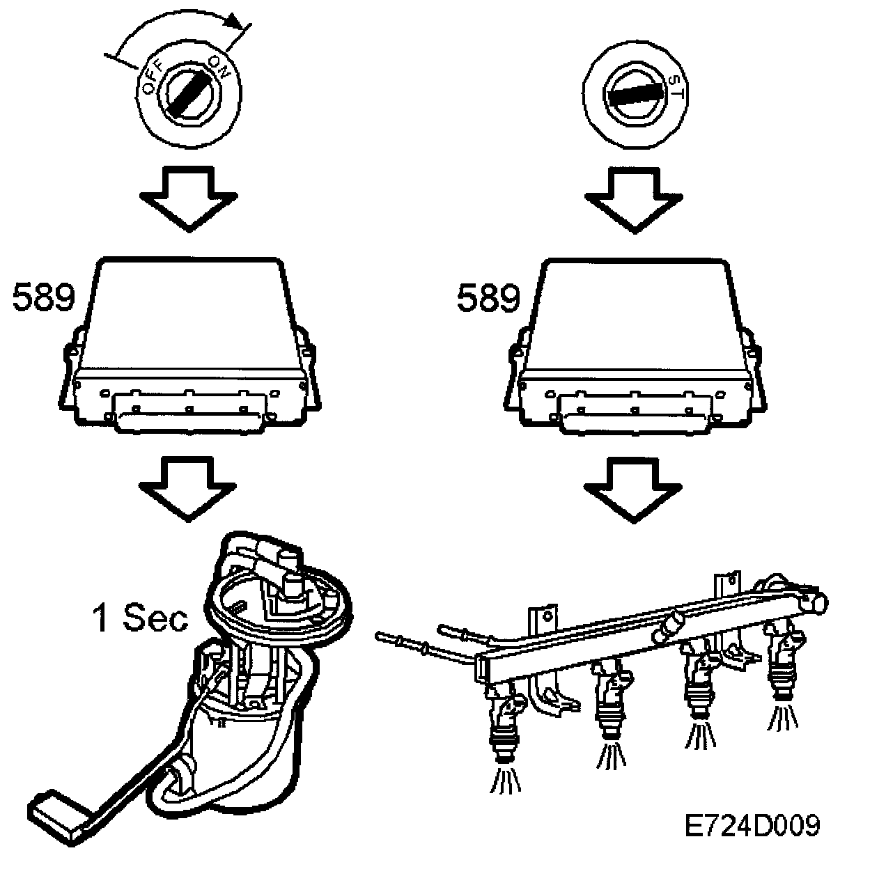 When the ignition is switched on, the Control module will be activated and the CHECK ENGINE lamp will go on continuously as a function check. The Fuel pump is activated for 1 second so that Fuel pressure will build up, after which the Control module will await pulses from the crankshaft position sensor.