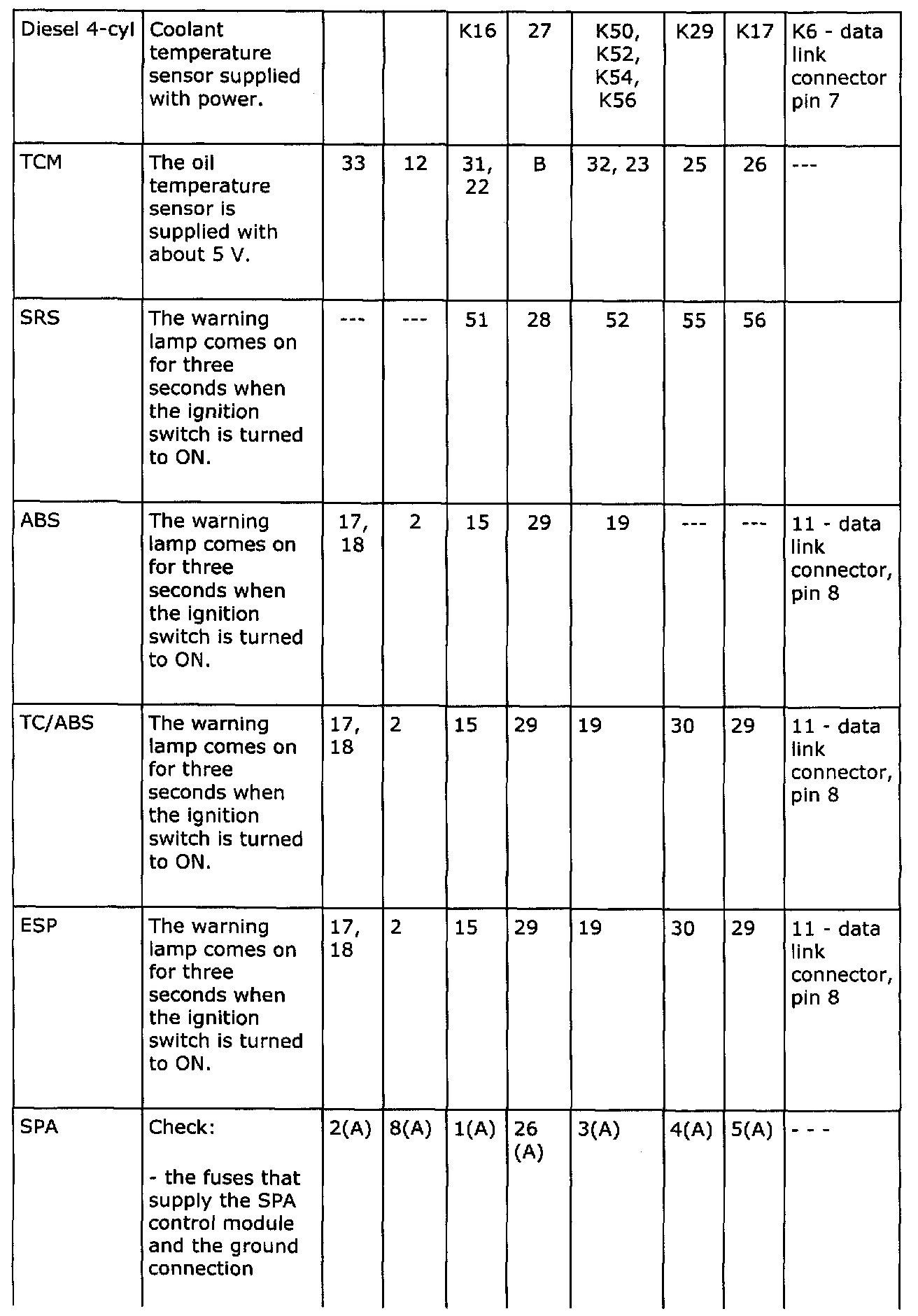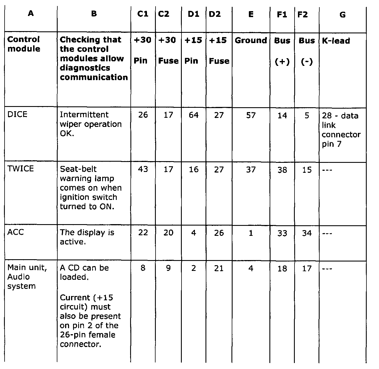 A simple means of checking whether the control modules are operative and allow diagnostics communication (column B) is given for each control module (column A) in the table below.