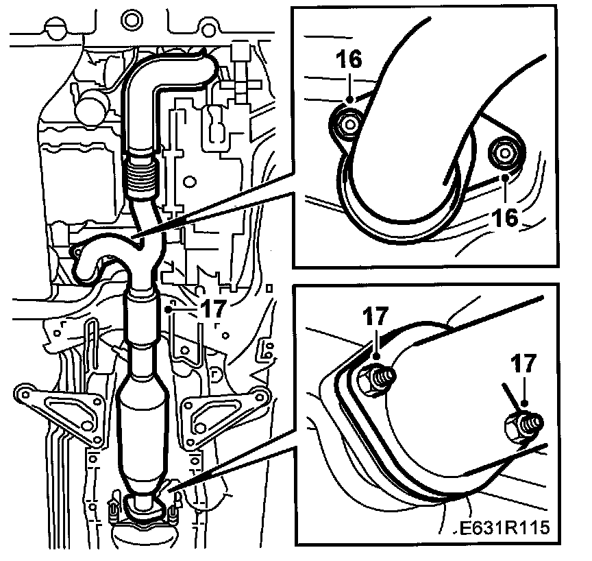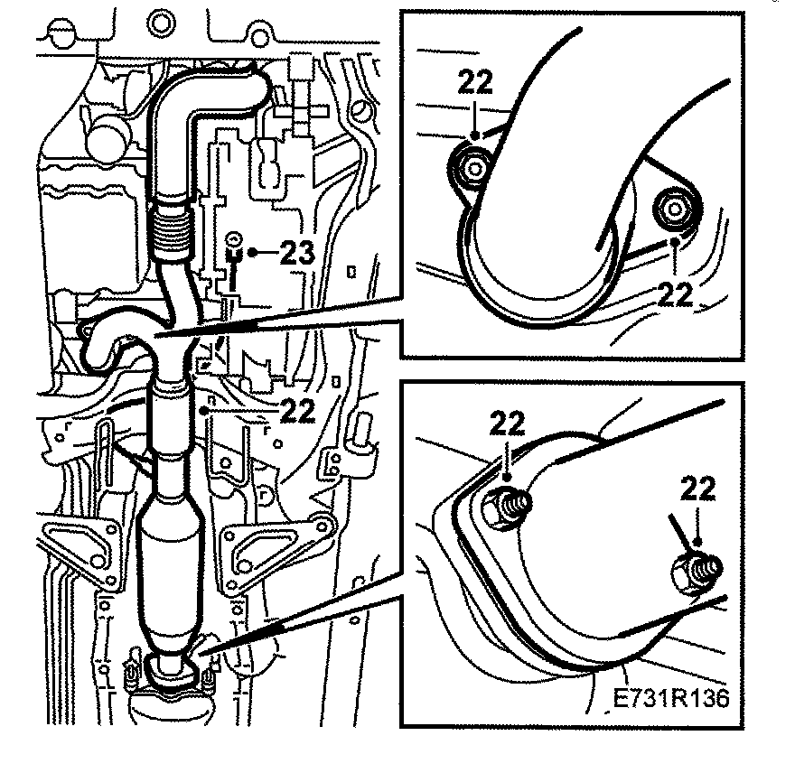 22. R4: Lift up the front part of the exhaust pipe and tighten the joint between the catalytic converter and silencer and the connection to the turbocharger.