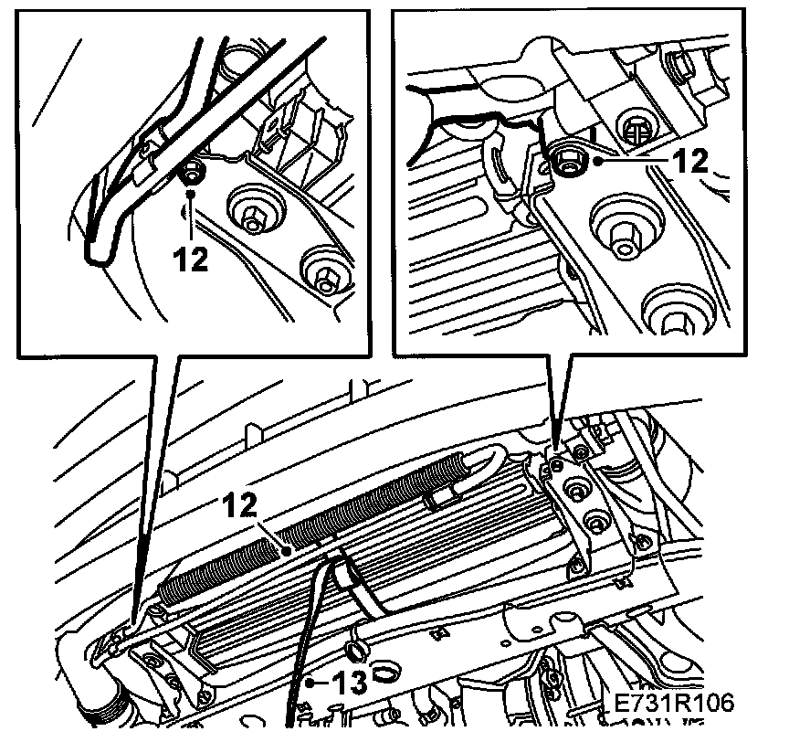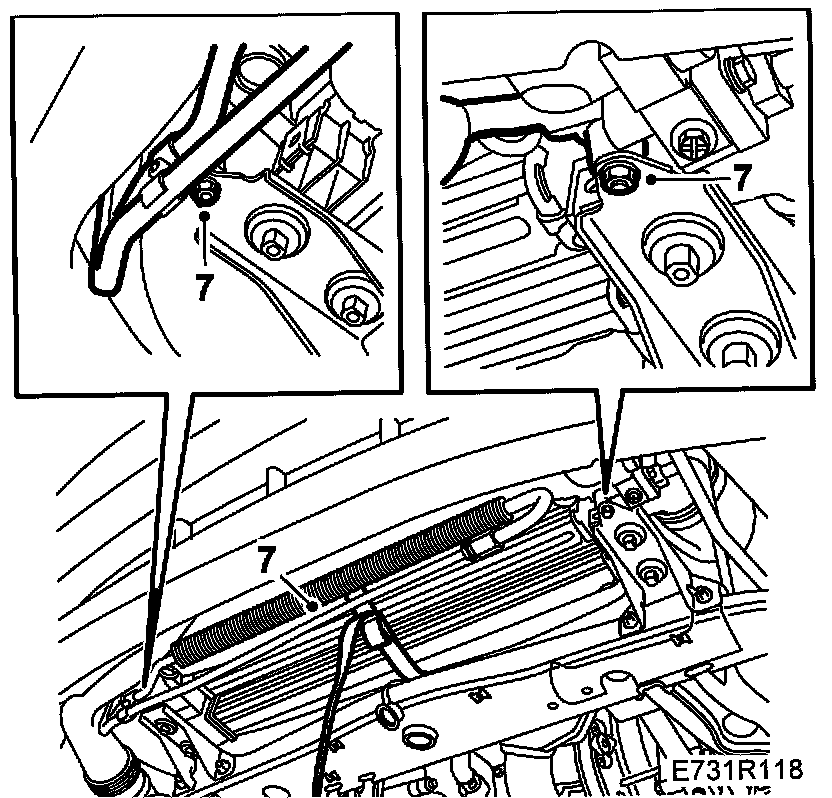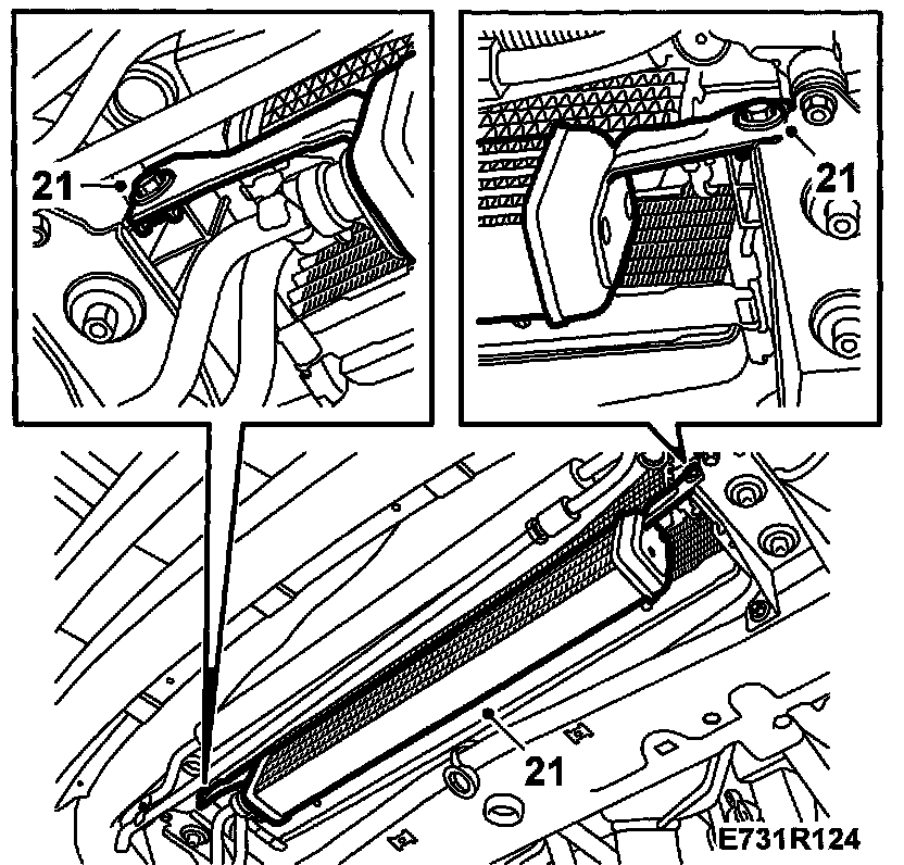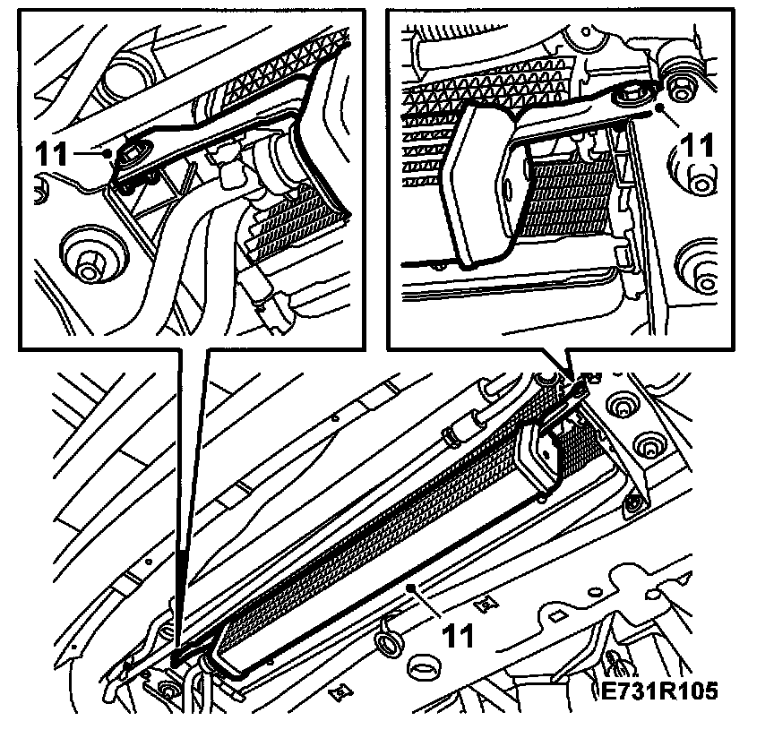 11. R4: Unbolt the engine oil cooler and allow it to hang from its hoses.