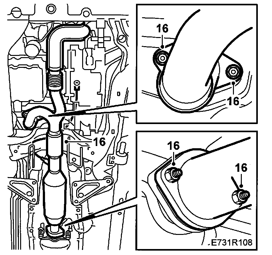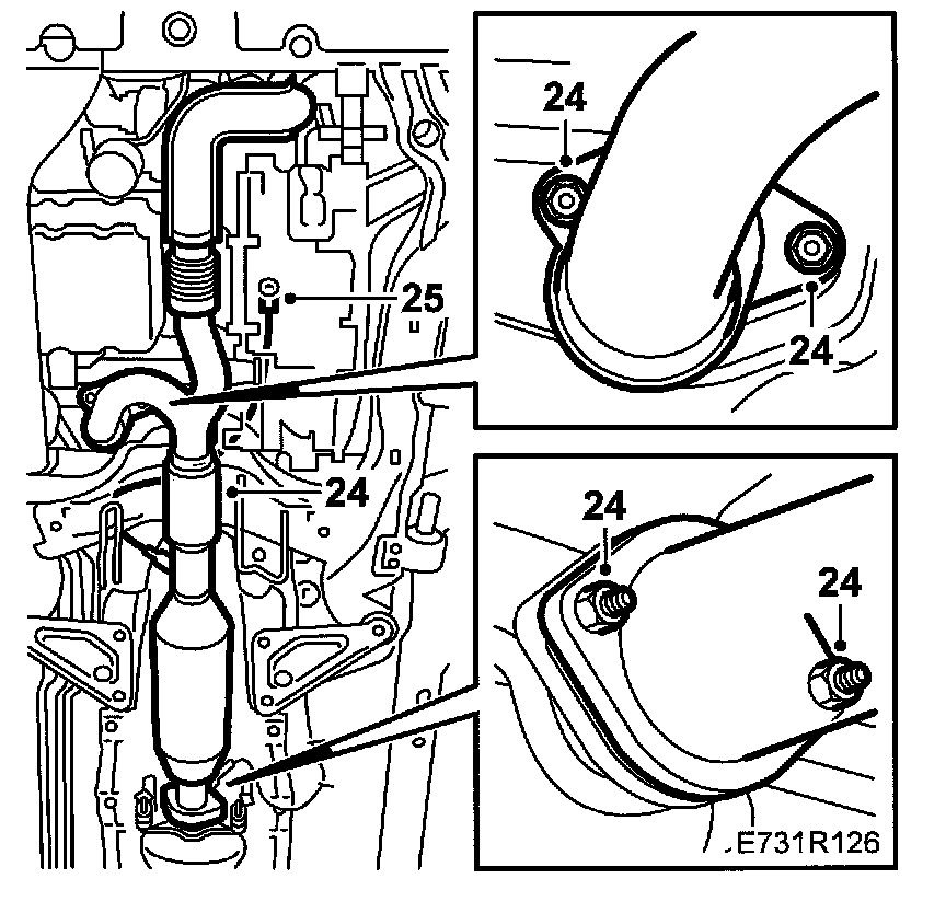 24. R4 engine: Raise the front exhaust pipe section and tighten the joint between the catalytic converter and the silencer as well as the connection to the turbocharger.