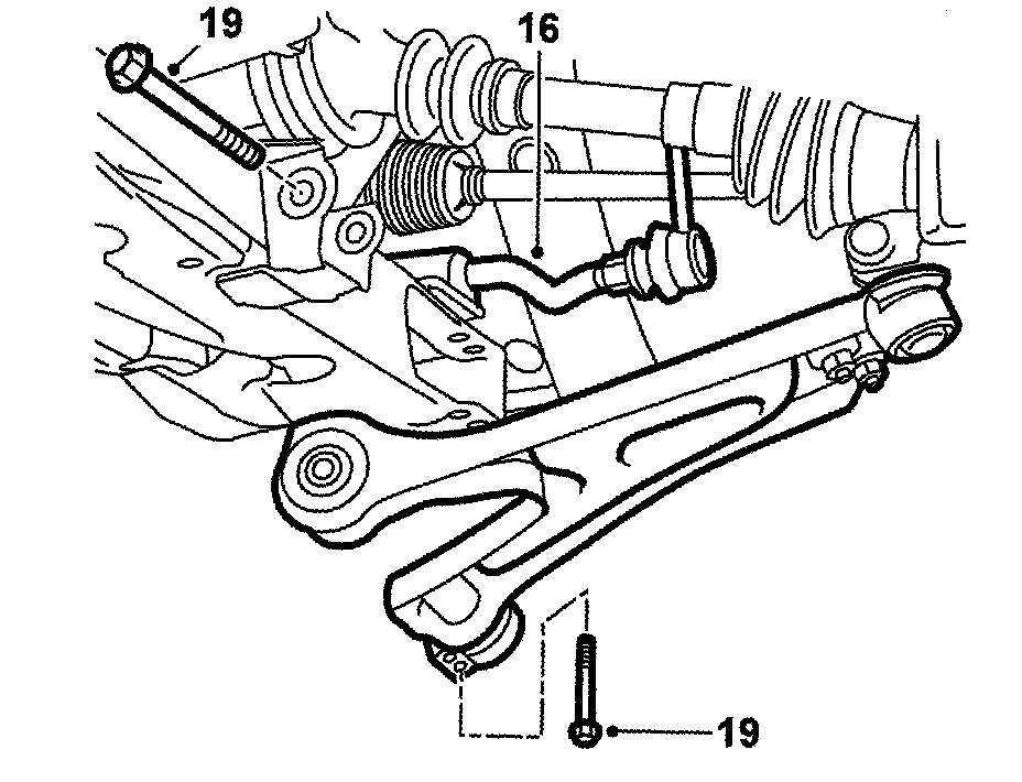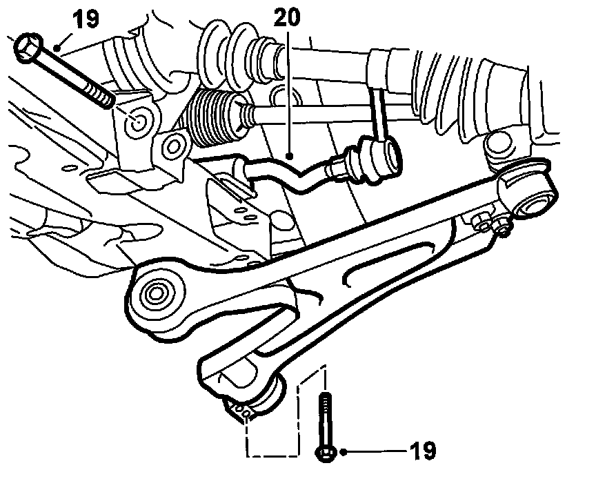 Note: The middle bolts on the subframe must not get mixed up with the others. The middle bolts have a smaller washer and 20 mm head.
