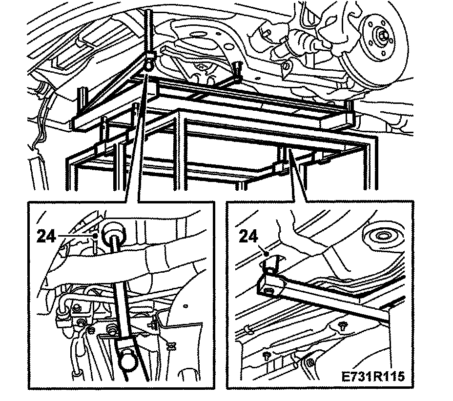 24. Run trolley lift 83 95 311 with parent fixture 83 94 801, intermediate support 83 95 170, basic fixture 83 95 188 and holder 83 95 196 underneath the car and remove the remaining subframe bolts.