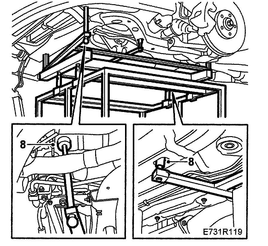8. Adjust the subframe so that the bolt holes are aligned with the body. There are two guide pins front left and rear right on the lifting trolley that will guide the subframe to its correct position.