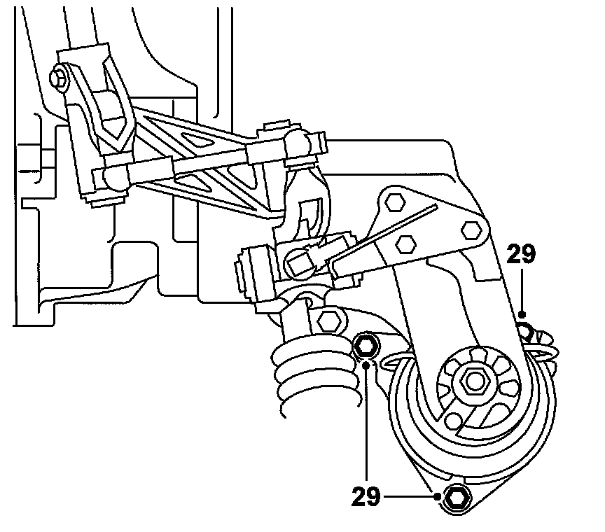 29. Remove the lifting beam and tighten the bolts securing the rear engine cushion to the subframe.