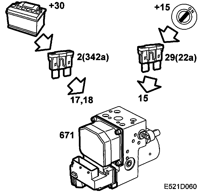 The +30-circuit power supply goes via fuse 1 (342a) to pins 17 and 18 on the control module.