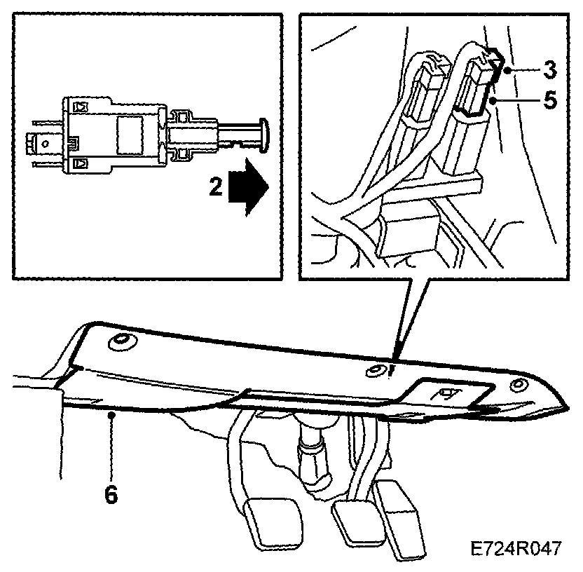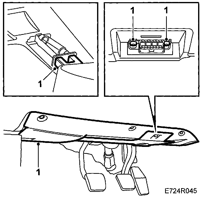 1. Remove the pedal bracket cover by undoing the 3 screws and the clip. Tilt the cover and carefully pull it out. Pay attention to the cables for the diagnostic tool data link connector and the lighting.