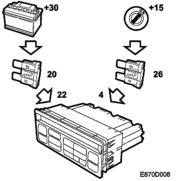 The ACC unit is supplied with current from the +30 circuit on pin 22 via fuse 20.