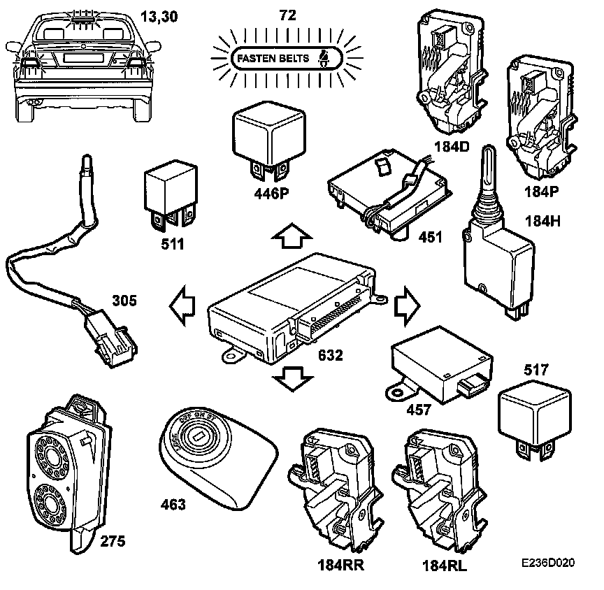 - Central locking motors doors, lock/unlock (184D, 184P, 184RL, 184RR)