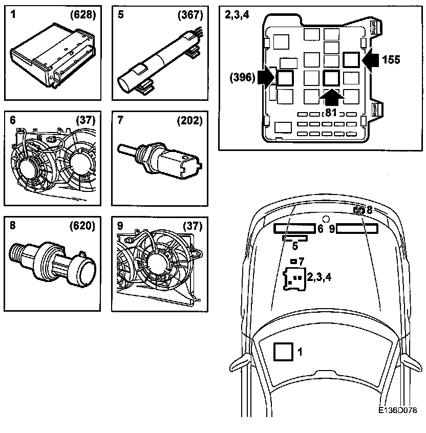 4. High speed RH radiator fan, relay (cars with A/C) (396)
