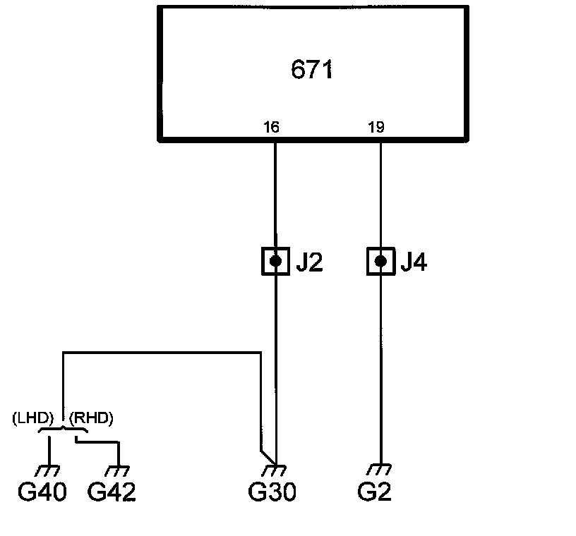 The pump motor is grounded through pin 16 to grounding points G30 and G40 (G42 RHD).