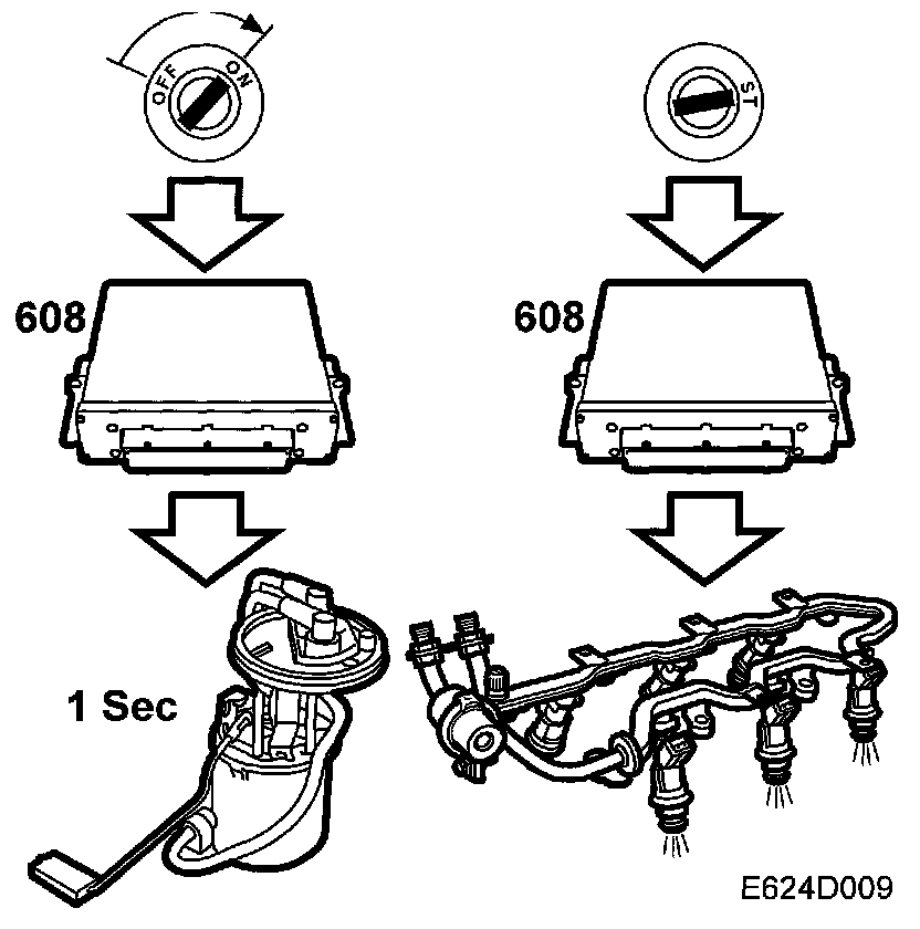 When the ignition is switched on, the control module will be activated and the CHECK ENGINE lamp will go on continuously as a function check. The fuel pump is activated for 1 second so that fuel pressure will build up, after which the control module will await pulses from the crankshaft position sensor.