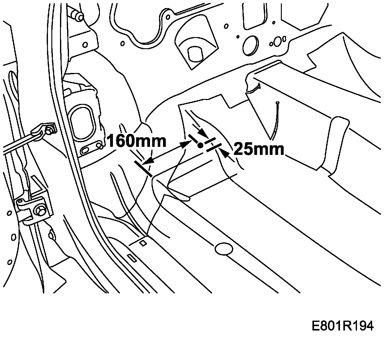 2. Measure 160 mm inwards from the corner of the pressing and 25 mm above it.