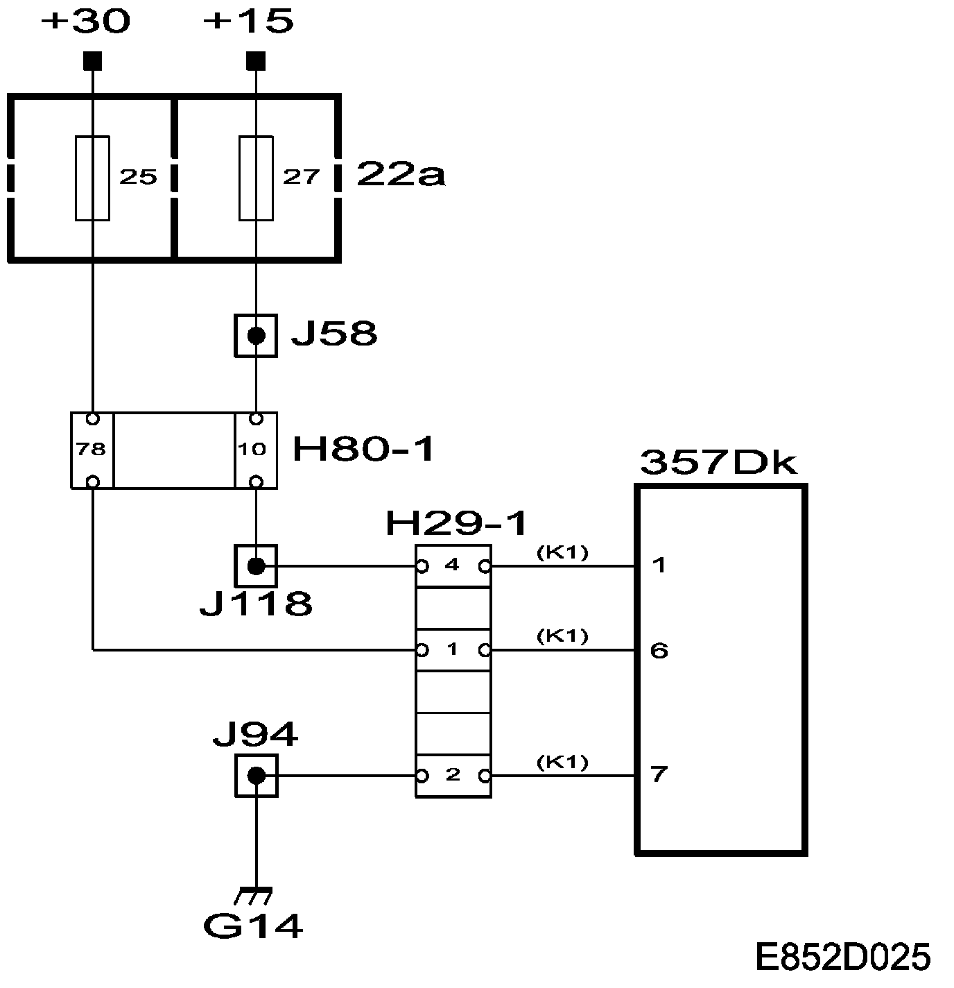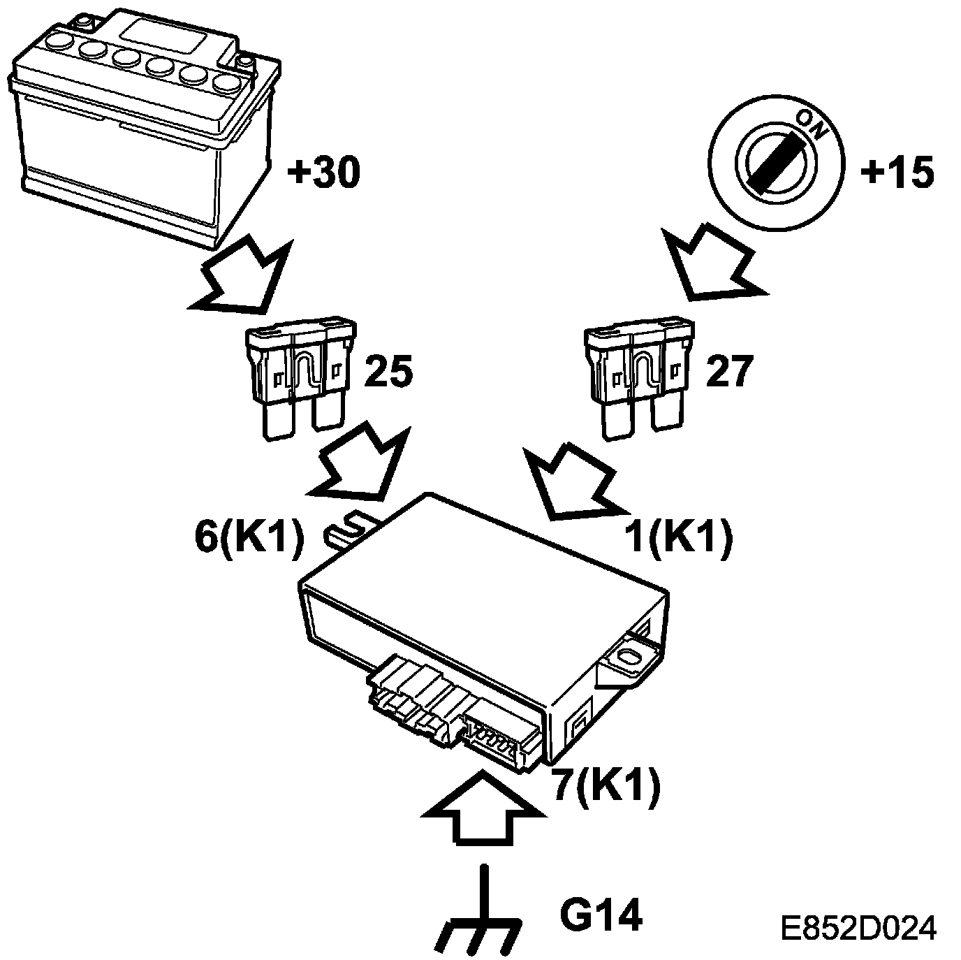 Power +30 is supplied via fuse 25 to control module pin 6.